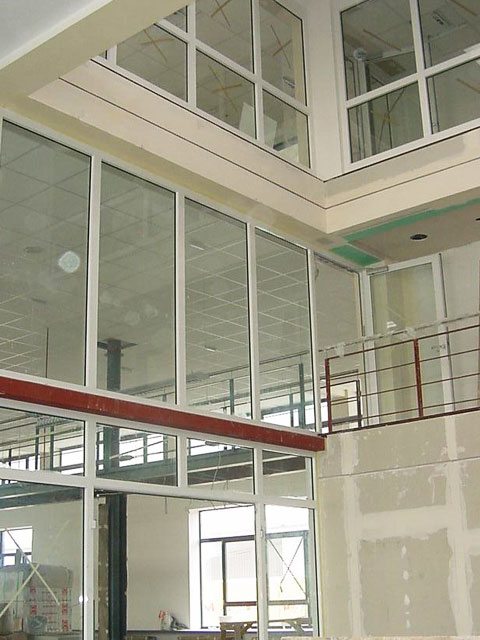 1800 m² Fassade, Fenster und Türen 400 m² Innenelemente mit Brandschutzverglasung 400 m² Sonderkonstruktionen (verschiebliche Lamellen) |